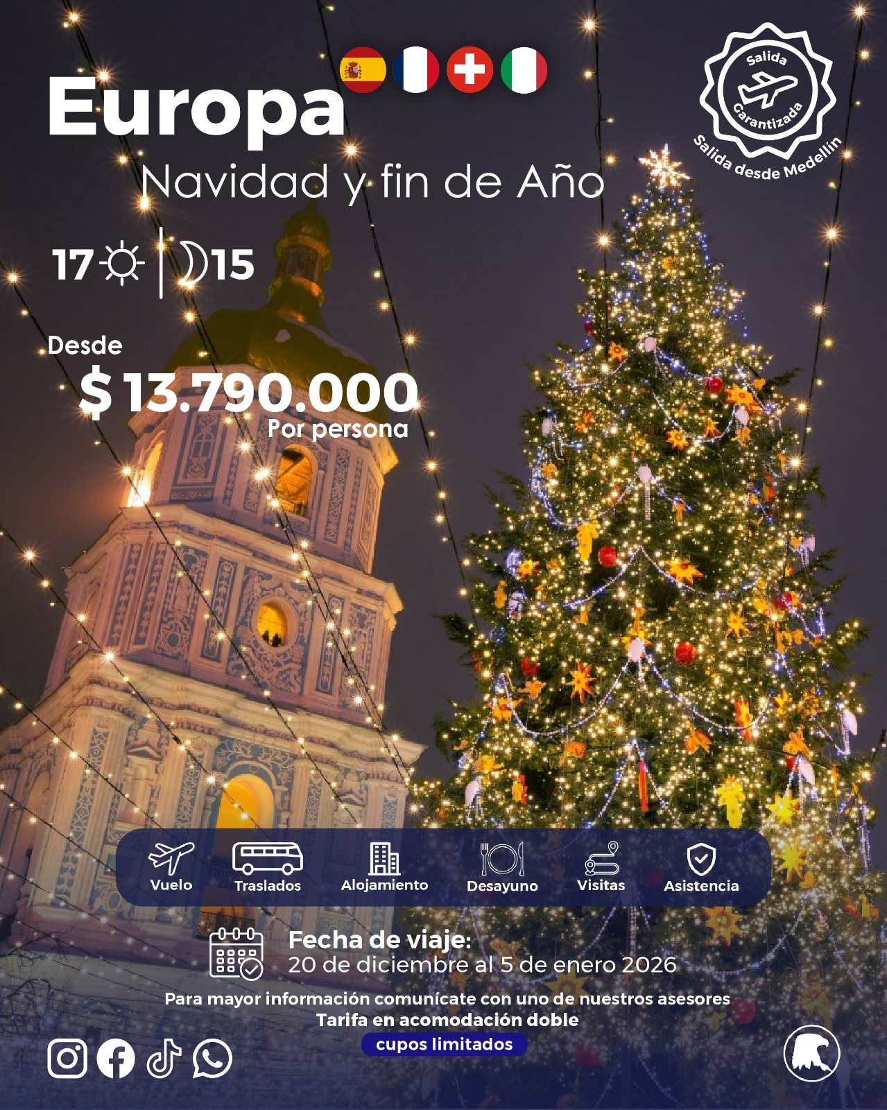Embárcate en una travesía mágica por España, Francia, Suiza e Italia. Desde el arte y la historia de Madrid, hasta los románticos canales de Venecia y los paisajes de los Alpes suizos, este circuito te lleva por ciudades icónicas como París, Roma, Florencia, Zúrich y Barcelona. Explora castillos, catedrales, callejuelas medievales y modernos bulevares, todo en una aventura diseñada para inspirar y enamorar. ¡Vive Europa como siempre la soñaste!